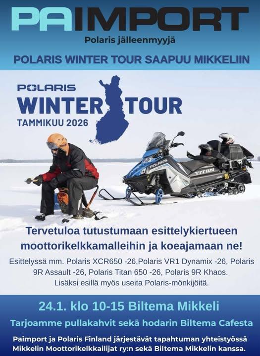 Lauantaina 24.1. Mikkelin Bilteman pihapiirissä on mahdollisuus tutustua ja koeajaa useita moottorikelkkamalleja. Paikalla myös Polariksen edustaja. Esillä myös useita Polaris-mönkijöitä.